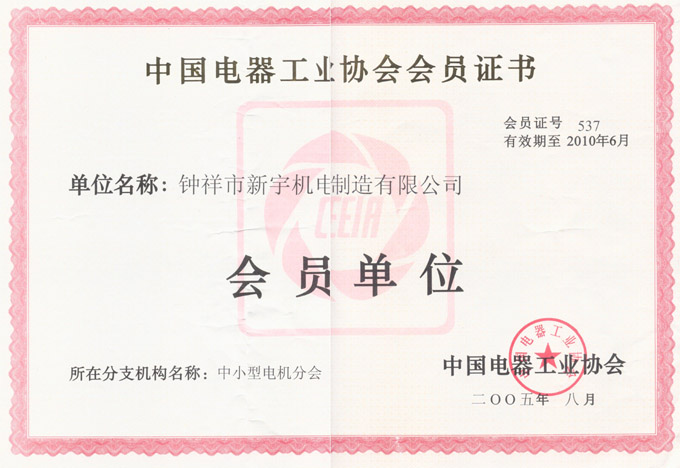 中国电器工业协会会员证书