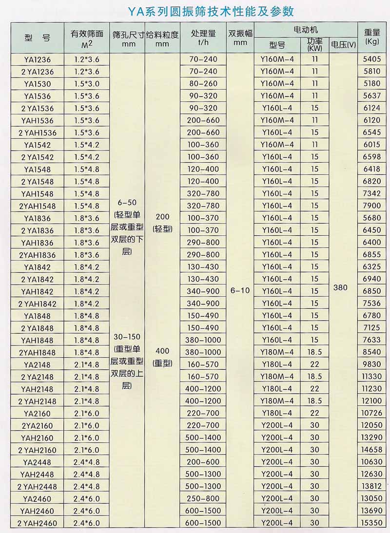 YA系列圆振筛是一种运动轨迹为圆的筛分设备,该机采用国外先进技术设计而成,具有技术参数先进,振动强度大,处理能力大,筛分效率高等特点,适合于选矿、选煤、建材、电力及化工等部门作物料分级使用。
