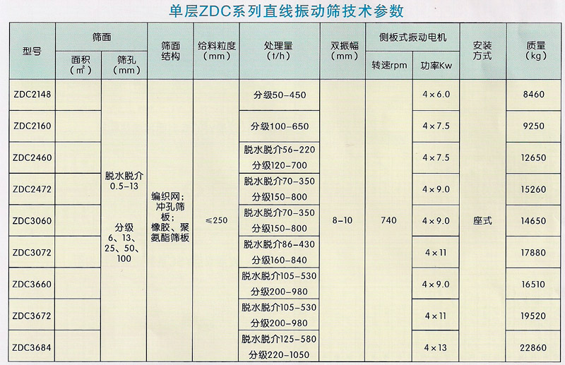 ZDC系列直线振动筛是一种利用侧板式振动电机为激振源的筛分机械,广泛适用于水电、煤炭、冶矿山、建材、化工等行业对中、粗物料进行分级和脱水。